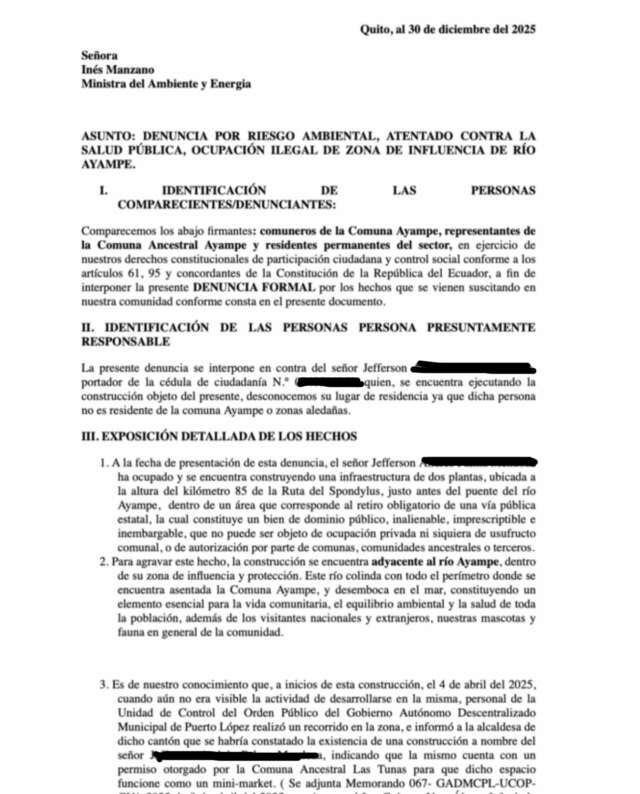 El río Ayampe baja cristalino desde la montaña y desemboca en un mar que es espacio de recreación, pesca artesanal y vida comunitaria. Hoy, ese equilibrio se ve amenazado por una obra que acumula ya tres denuncias formales, la más reciente presentada ante el Ministerio del Ambiente y respaldada por más de un centenar de habitantes, quienes cuestionan tanto la construcción como la forma en que fue entregado el terreno donde se levanta.