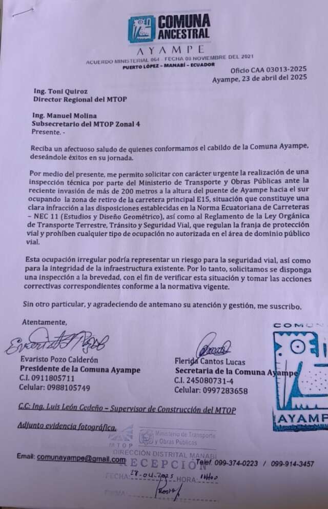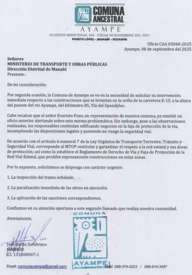 El 8 de septiembre de 2025, al percatarse de que se reactivó la construcción, la comunidad de Ayampe presentó una segunda denuncia ante el MTOP. Esta vez, no hubo respuesta ni acciones visibles por parte de las autoridades.