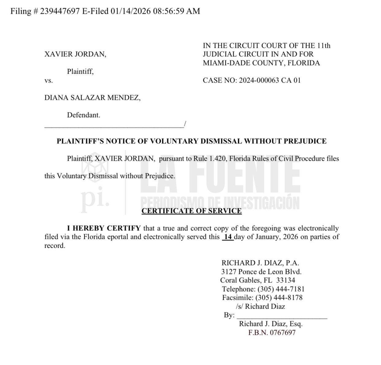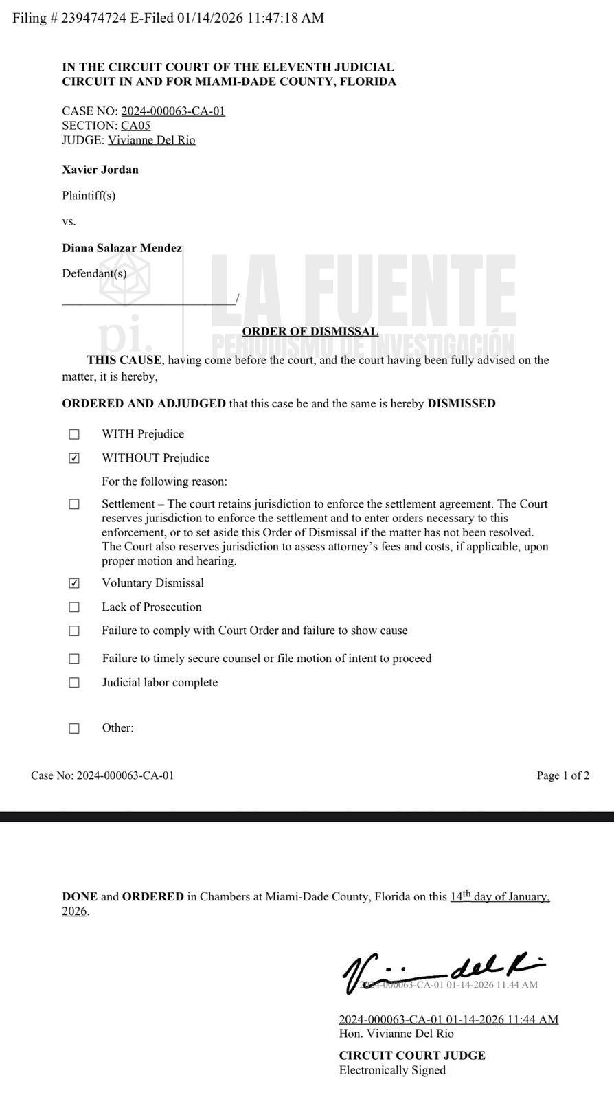 Así lo acreditan dos documentos oficiales del Tribunal de Circuito del Condado de Miami-Dade, Florida, fechados el 14 de enero de 2026: el Aviso de Desistimiento Voluntario sin Perjuicio, presentado por el propio Jordán, y la posterior Orden de Desestimación firmada por la jueza Vivianne Del Rio, que terminó por finalizar el proceso.