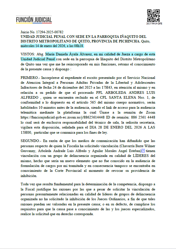 Ayala dispuso que Luis Arboleda, alias Gordo Luis, cabecilla de Los Lobos recluido en el CPL Santa Elena N.º 1, participe en la audiencia del 28 de enero, mediante enlace virtual habilitado diez minutos antes del inicio.